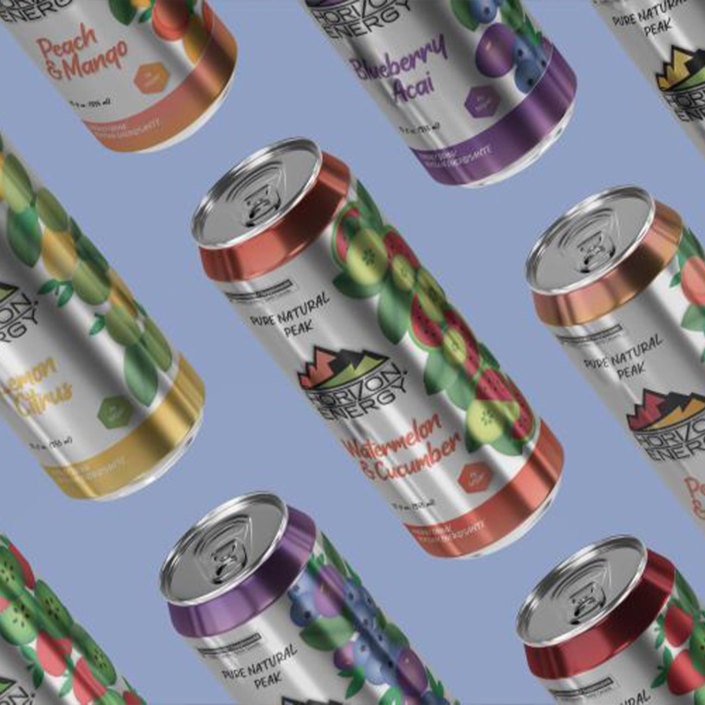 Horizon Energy+ is a clean, natural energy drink for health-conscious, active individuals. The brand identity highlights “HORIZON” with a logo featuring a mountain peak to evoke nature and calm performance. A sharp, angular “z” hints at lightning, suggesting energy while maintaining a minimalist feel. Each flavour uses a unique gradient logo, fruit-inspired colour palette, and icon set. Illustrations on the silver can create a natural, refreshing look.
